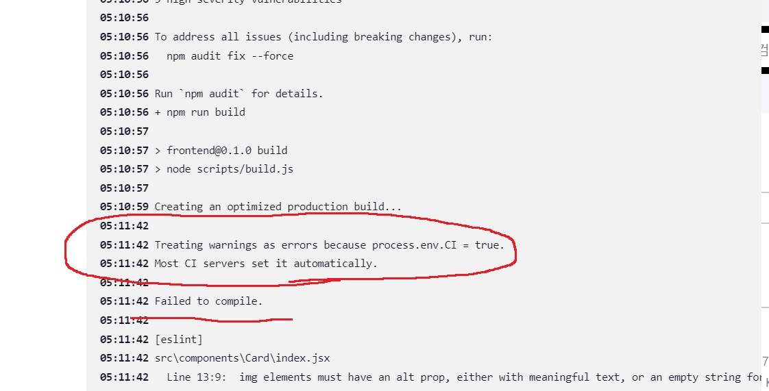 빌드할때 CI=false를 안주면... 기본이 CI=true라고 뭐라뭐라하다가 compile fail이 뜨면서 빌드가 안됨