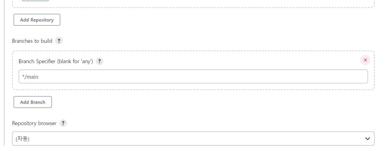 아래에 branches to build에 빌드할 브랜치를 입력한다