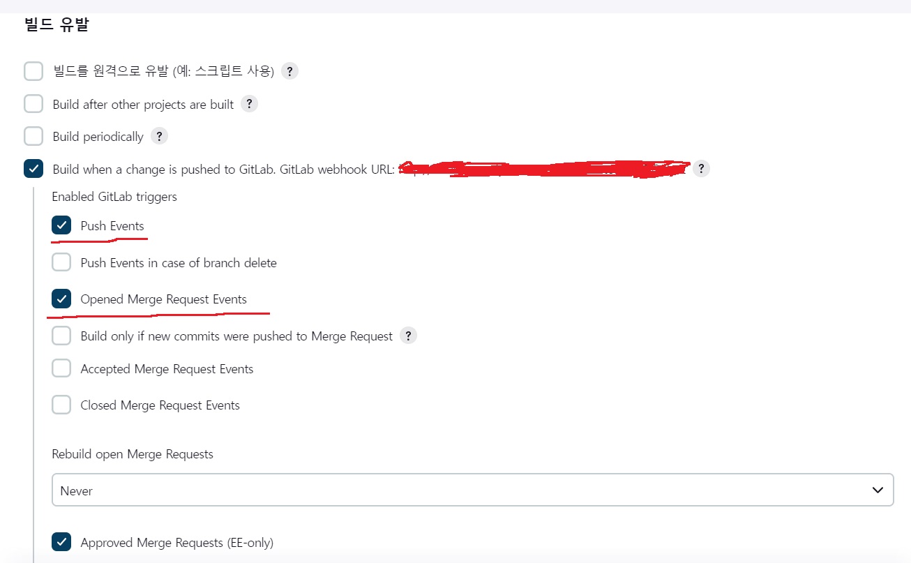 enabled gitlab triggers 설정에 push events, opened merge request events 부분 체크