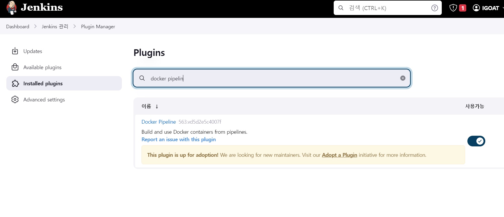 docker 이미지 빌드를 위해 docker pipeline이라는 플러그인 설치