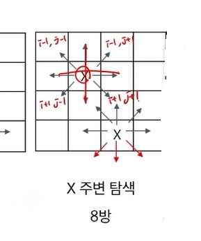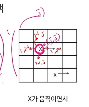 그리고 이렇게 2차원 배열 탐색에서 주의할 점은 전체 공간을 벗어나지 않도록 막아주는 if문 코드가 필요하지..
