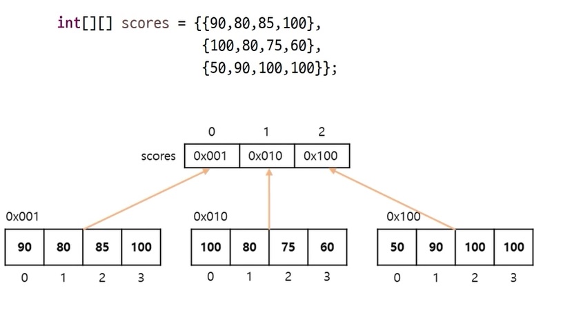2차원 배열은 배열 요소로 1차원 배열의 참조를 가진다
