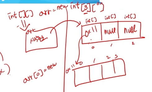arr2가 stack에 공간 생기고.. new int[2][];하면.. heap에 크기 2인 배열이 생기는데 각 원소는 null로 초기화되어 있다