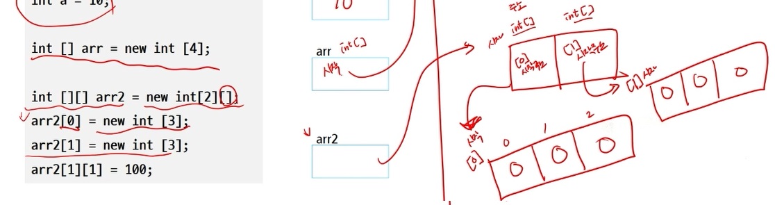 마찬가지로 arr2[1] = new int[3];도 heap에 새로 크기 3인 정수형 배열 공간이 생기고... 각 원소는 0으로 초기화되어 있으며