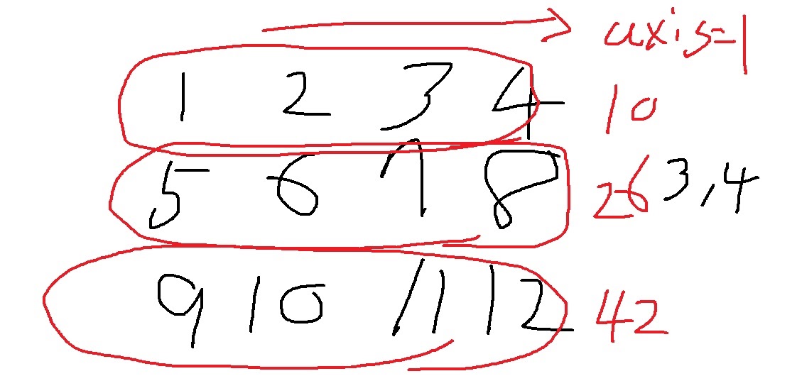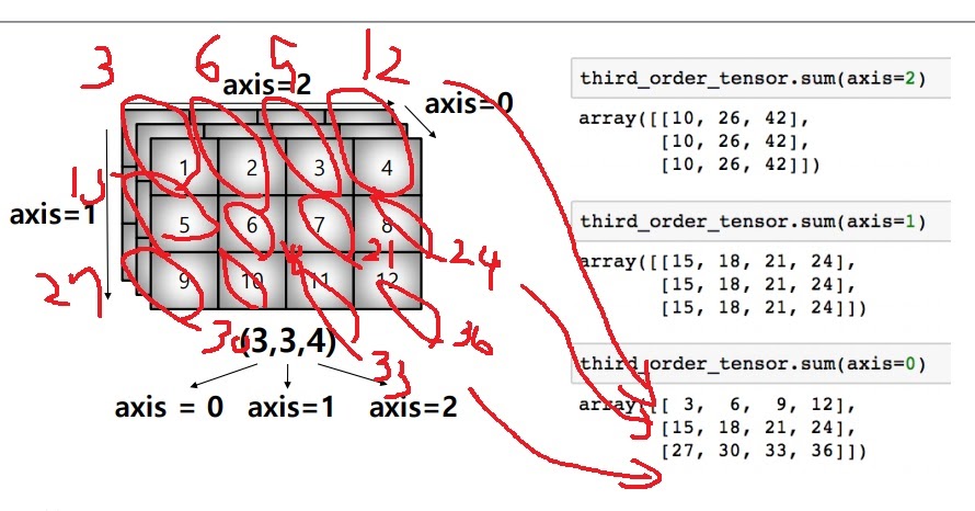 그림2에서 (3,4) array의 원소 합 sum()을 구한건데 axis=1이 shape에서 4를 나타내니까 원소 4개 있는 방향으로 sum을 함