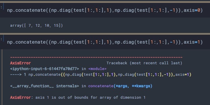 array([7,12])랑 array([10,15])는 차원이 0차원이어서 axis=0밖에 없어서 그렇다