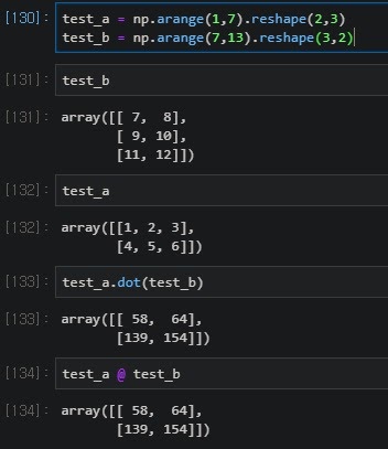 dot product는 일반적인 행렬곱으로 a.dot(b) , a@b