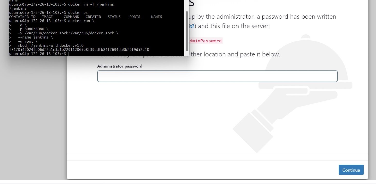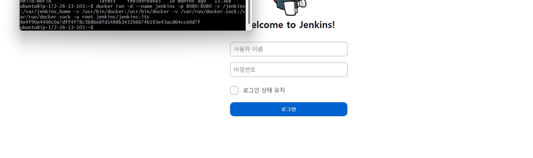 $ docker run -d --name jenkins -p 8080:8080 -v /jenkins:/var/jenkins_home -v /usr/bin/docker:/usr/bin/docker -v /var/run/docker.sock:/var/run/docker.sock -u root jenkins/jenkins:lts