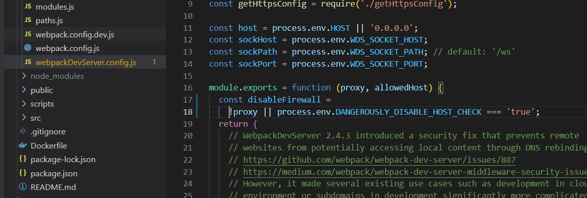 React : Invalid host header 리액트에 외부에서 도메인을 접속할려고 할 때 Invail host header라는 오류로 접속이 안됐습니다. 구글링 결과 webpackDevServer.config.js 안에 {disableHostCheck: tru