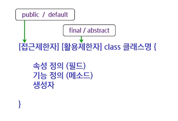 접근 제한자 활용 제한자 class 클래스명 { 속성, 메소드, 생성자 }