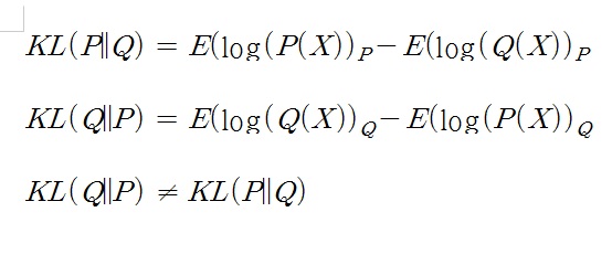 $$D _{KL} (P||Q)=-H(P)+H(P,Q)=E(log(P(X)) _{P} -E(log(Q(X)) _{P}$$