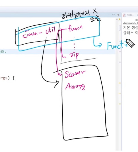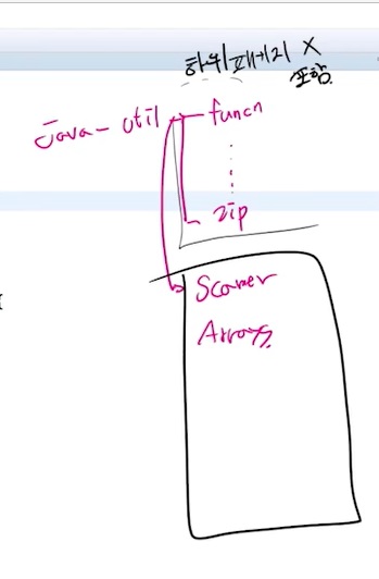 패키지는 클래스들을 구분하기 위한 이름 공간으로 Scanner, Arrays,... 등등은 java.util이라는 이름 공간 안에 존재함