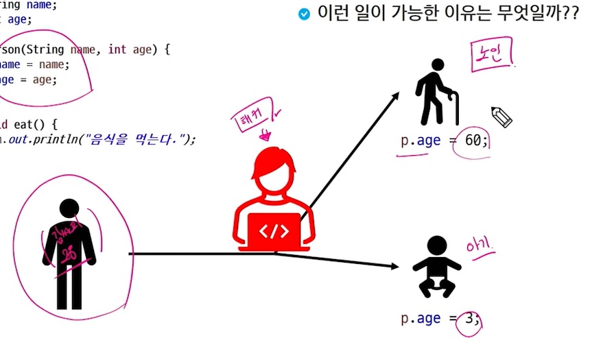아무튼 내가 김태연이라는 28살의 인스턴스 p를 만들었는데 해커가 접근해서 p.age = 60;으로 바꾸거나 p.age = 3;으로 바꾼다면..?