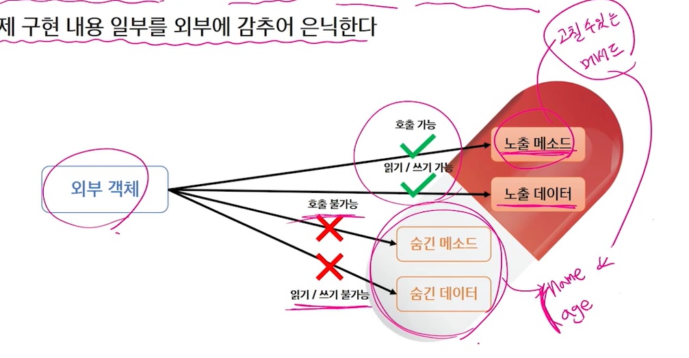 name, age같이 중요한 부분을 숨겨서 외부에서 호출 못하고 읽기, 쓰기도 못하게 하고
