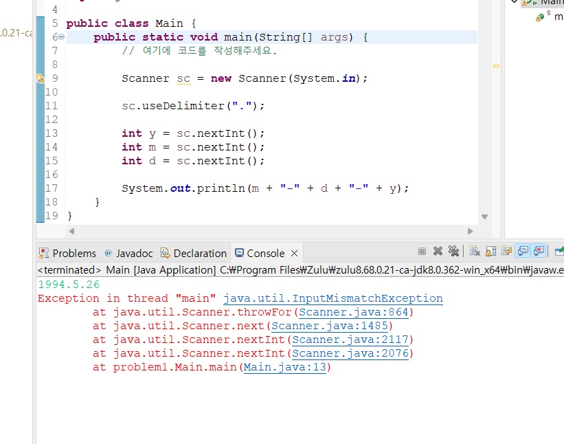 "useDelimiter안의 값은 정규 표현식을 사용하는데 정규 표현식에서 "."은 '모든 단어'와 같은 의미를 가지고 있어서 오류가 발생한다.
