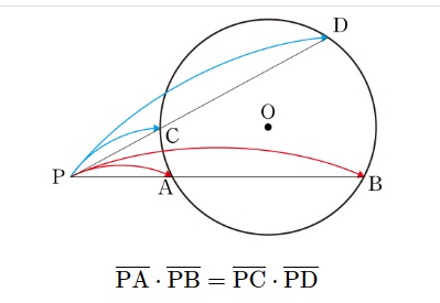 역시 PAC와 PDB가 서로 닮음이고, PA:PD = PC:PB이므로, PA * PB = PC * PD이다.