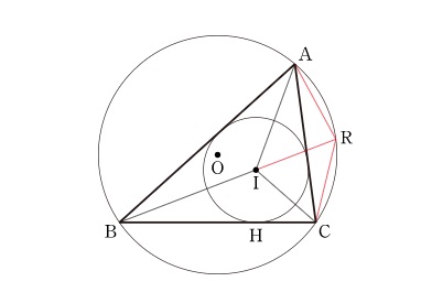 삼각형 ABC의 외접원이 O이고 내접원이 I이며, 직선 BI가 외접원과 만나는 점이 R이라고 하자.