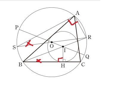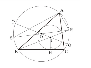 B에서 내심 I를 지나 외접원과 만나는 점이 R일때, 직선 IO가 외접원과 만나는 점이 P,Q라고 하자.