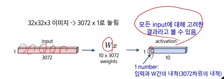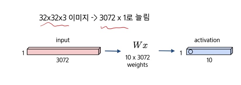 W는 10*3072로 설정하면 Wx는 fully connected layer를 통과한 값이다.