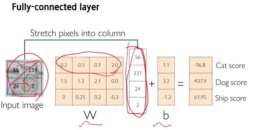계산된 결과를 b 벡터와 더해서 우변의 class에 대한 score를 도출하게 됨