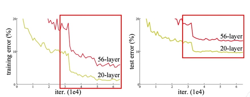 training error와 test error 모두 56-layer가 20-layer보다 높았다