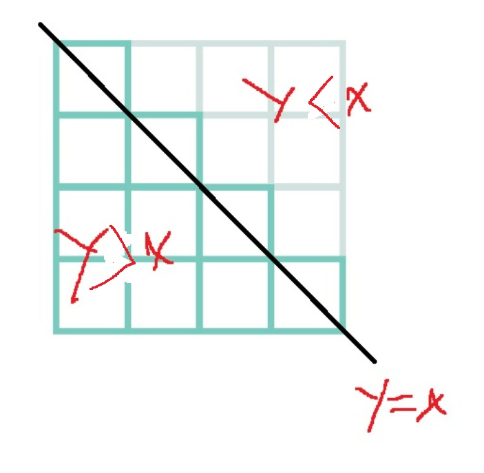 대각선 부분은 y=x일때이고, 대각선 아래는 y > x이고 대각선 위는 y < x
