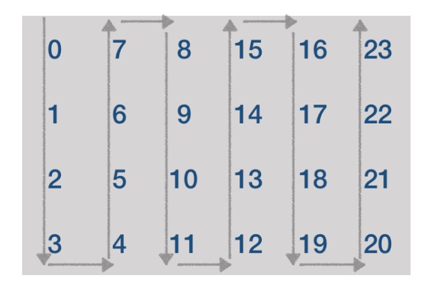 짝수번째 x열에서는 y가 증가하는 방향이고 홀수번째 x열에서는 y가 감소하는 방향이니까..