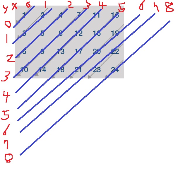 배열에서 좌표가 (x,y)이면.. 오른쪽 아래 사선방향으로는 x+y가 일정하다