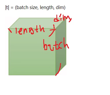 NLP에서 tensor는 보통 (batch size, 문장의 길이(length), 단어 벡터의 차원(dim))이라는 3차원 tensor를 사용