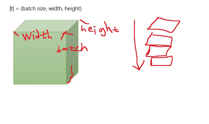 여러 장의 이미지, batch size로 구성한다면 위와 같은 3차원 tensor가 된다.