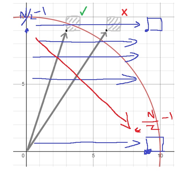 이런식으로 모든 x,y에 대해, x가 (n/2)-1이고 y가 0일때까지 우측 하단으로 훑으면서 원의 둘레가 타일 위에 있을 조건을 하나씩 조사해보면 될 것이다.