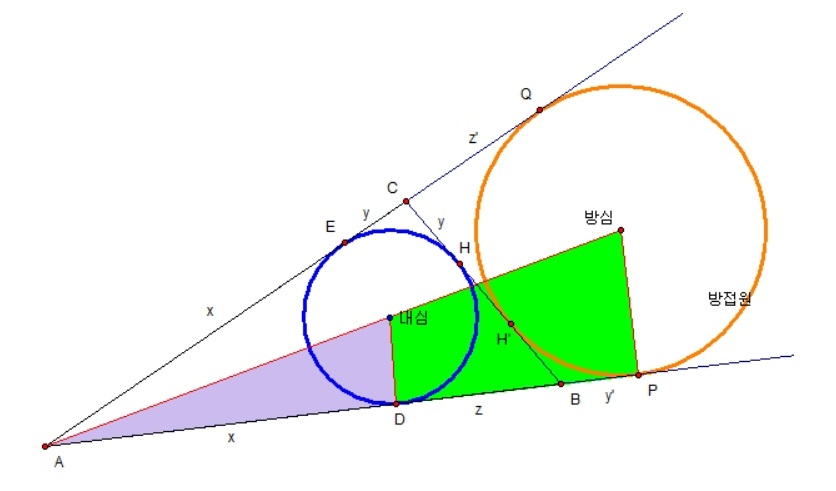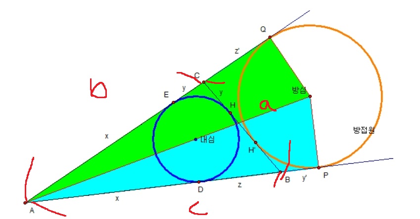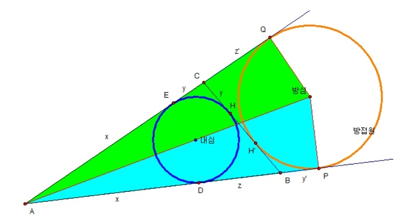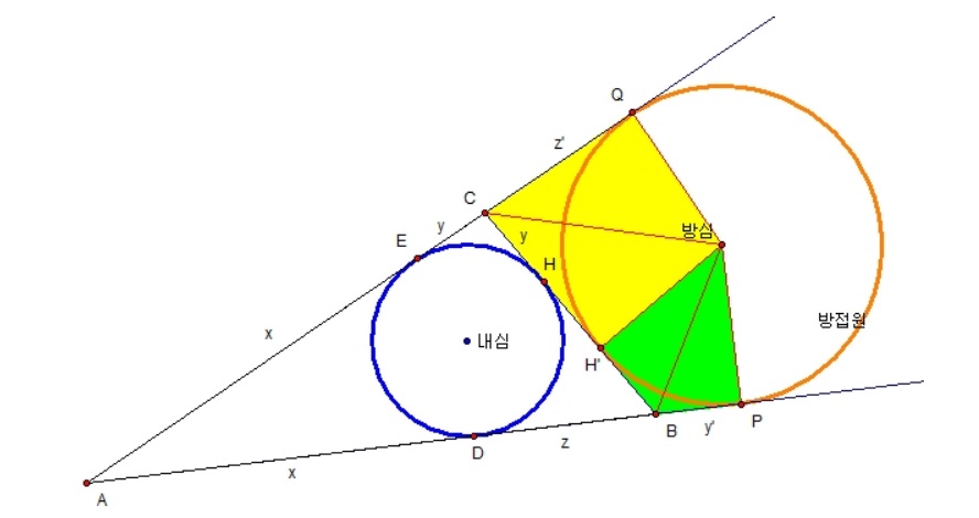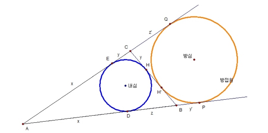 당연하게도 원 밖의 한 점 C에서 방점의 접선 CQ = CH'이고 B에서 BP = BH'인데.. 왜 그런지 잠깐만 생각해보면
