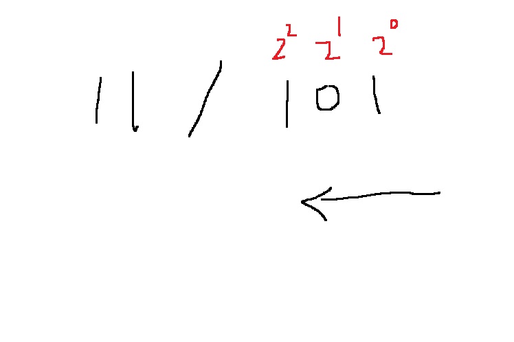 읽어낸 101을 10진수로 바꿔줄려면, 맨 앞 자리는 $2^{2}$ 자리이고, 두번째는 $2^{1}$자리이고 3번째는 $2^{0}$자리이다.