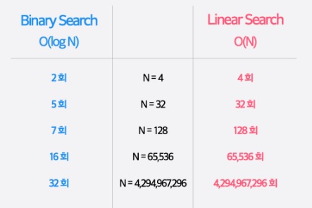 이분탐색의 시간복잡도는 O(logN)이고, 순차탐색의 시간복잡도는 O(N)이다.