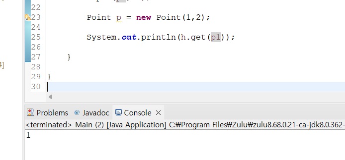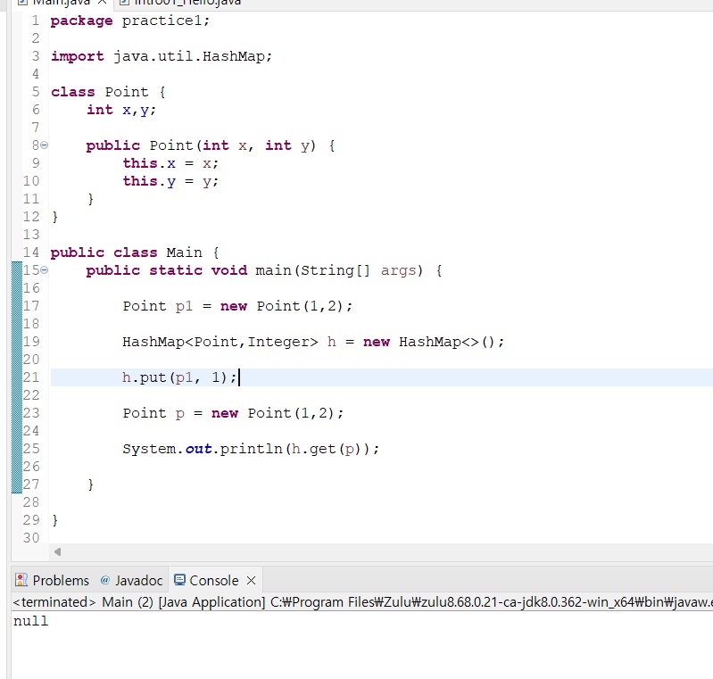 따라서 Point를 다음과 같이 정의하고 진짜로 HashMap이 내가 원하는대로 동작하는지 테스트해본다면..?