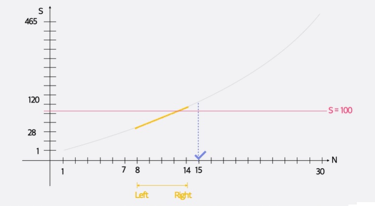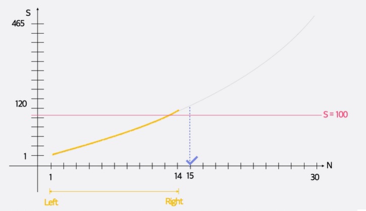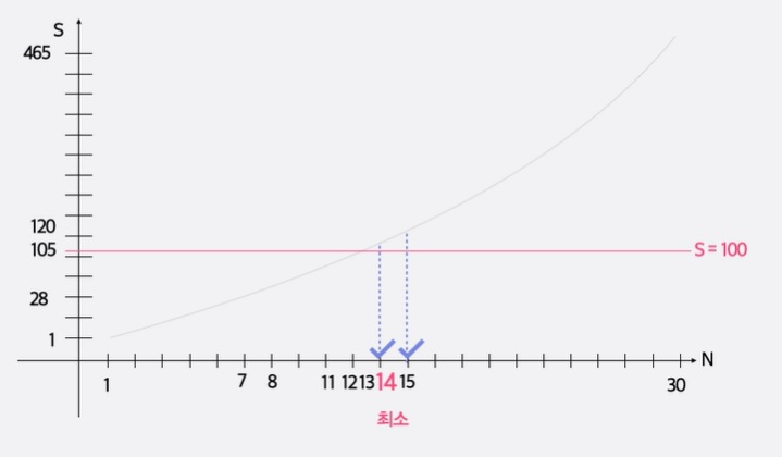 무작정 문제를 푼다면, 1,2,3,...,30 전까지 계속 더해보면서 최초로 합이 100을 넘는 경우, 그 숫자를 return하게 된다.