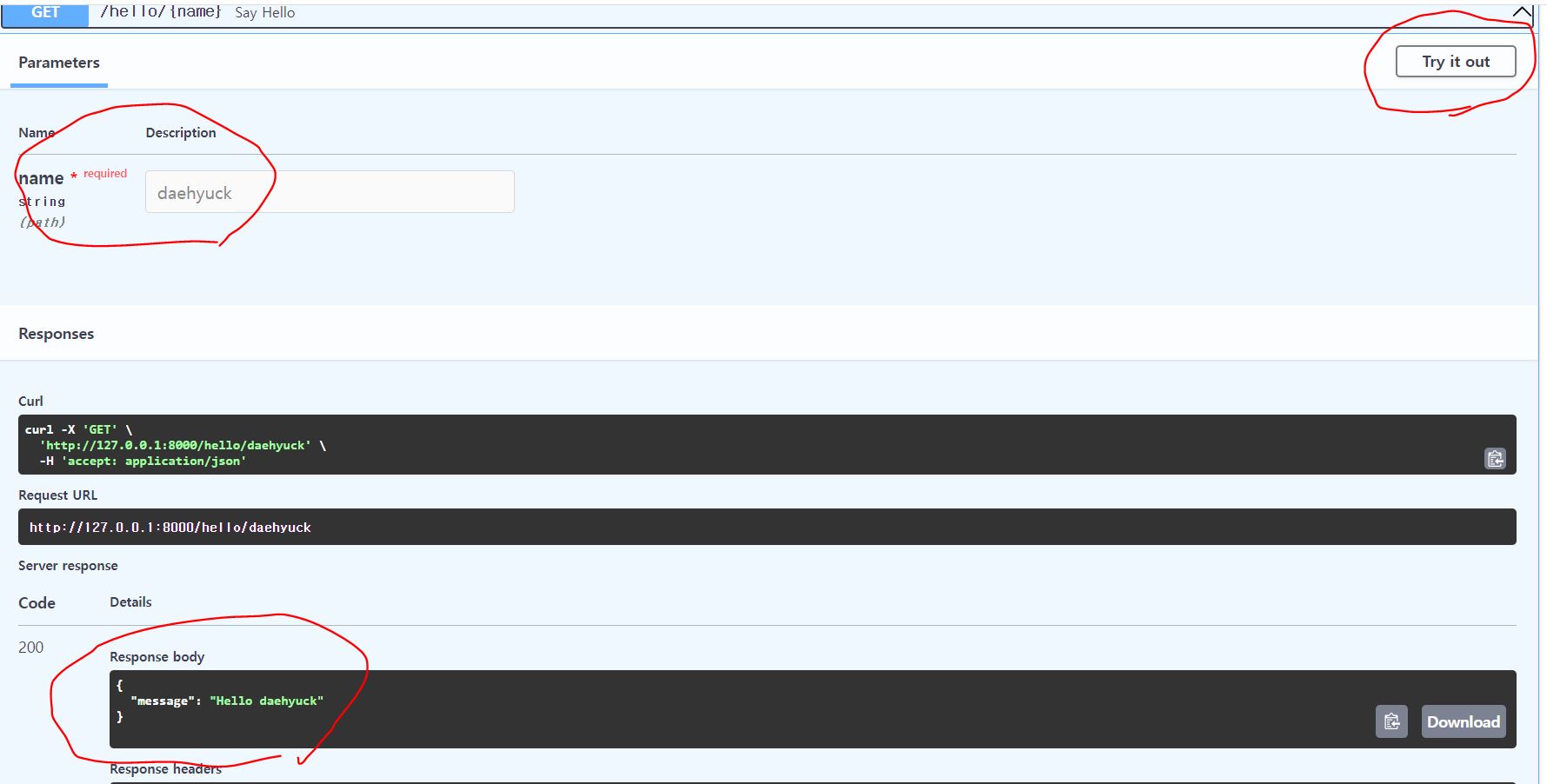 try it out을 누르고, name에 원하는 값 입력하고.. execute를 클릭하면 실행시켜줌