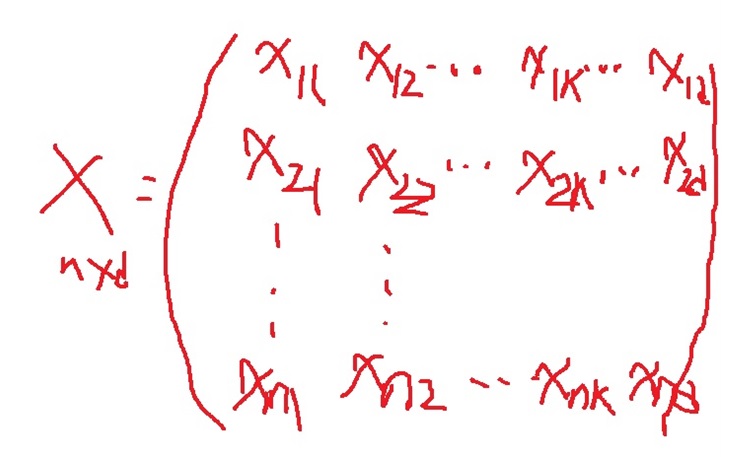 $x _{1} ^{T} =(x _{11} ,x _{12} ,x _{13} , \cdots ,x _{1d} )$ , $x _{2} ^{T}=(x _{21} ,x _{22} ,x _{23} , \cdots ,x _{2d} )$, .... , $x _{k} ^{T} =(x _{k1} ,x _{k2} ,x _{k3} , \cdots ,x _{kd} )$, .... , $x _{n} ^{T}=(x _{n1} ,x _{n2} ,x _{n3} , \cdots ,x _{nd} )$ 이라고 하면,