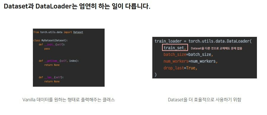 물론 dataset에 dataloader기능을 구현할 수는 있지만 모델 개발이나 재활용측면에서도 분리하는 것이 좋다