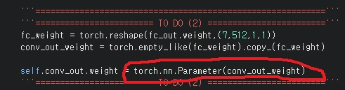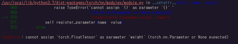 torch.nn.Parameter()함수로 parameter tensor로 만들어서 weight에 넘겨줬다.