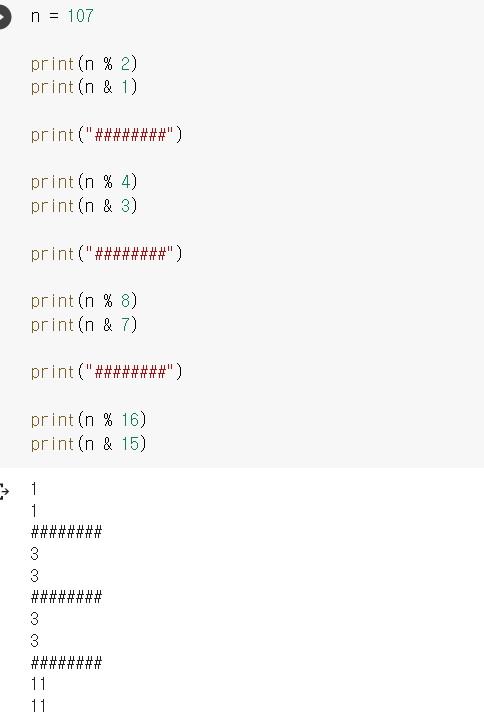 일반적으로 정수 N을 $2^{n}$으로 나눈 나머지는... N과 $2^{n}-1$의 &연산으로 구할 수 있다.
