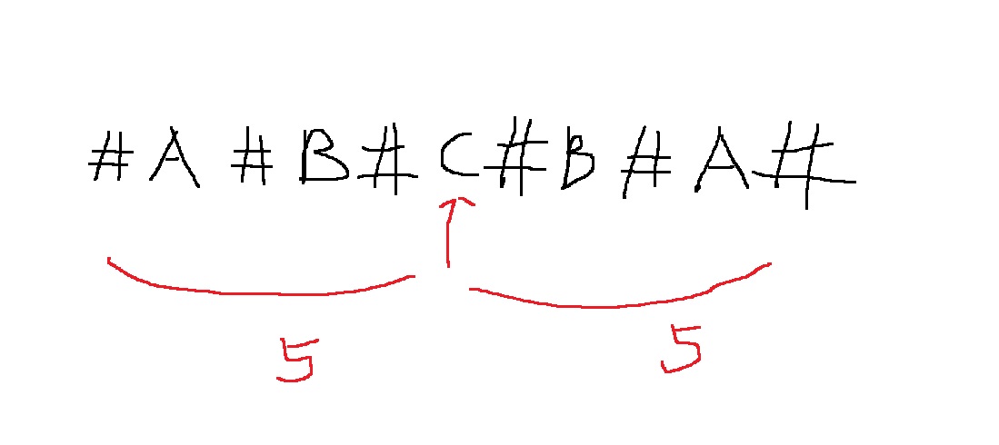 #A#B#C#B#A#으로 바꾸고 나서.. 각 index에 대해서 양쪽으로 확대해나가 회문인지 찾아나갈텐데