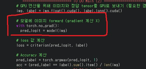 validation에서는 불필요한 gradient를 계산하지 않기 위해 with torch.no_grad():로 걸어준다