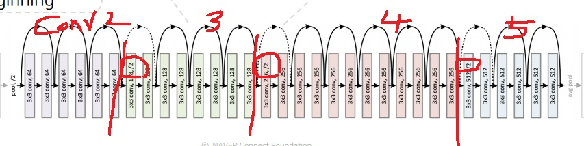 basic block을 사용하며 위에서 4개의 큰 block으로 나눴던 것이 conv2,3,4,5임