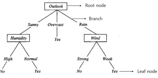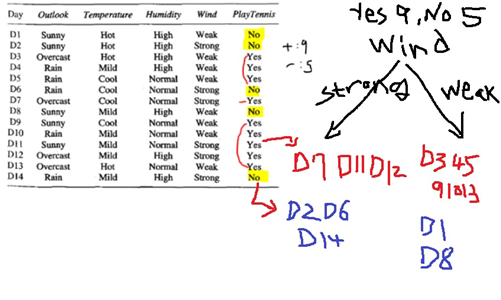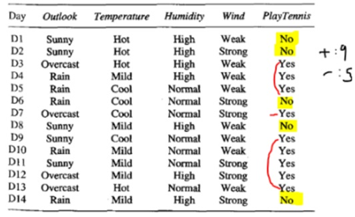 현재 D1~D14까지 data를 outlook, temperature, humidity, wind라는 feature를 이용하여 target 변수인 play tennis의 yes or no 여부를 구분해야합니다.