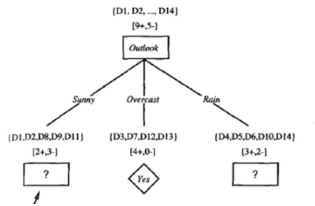 주목할 부분은 overcast로 분기된 부분은 모든 data가 yes이므로 더 이상 구분할 필요가 없습니다.