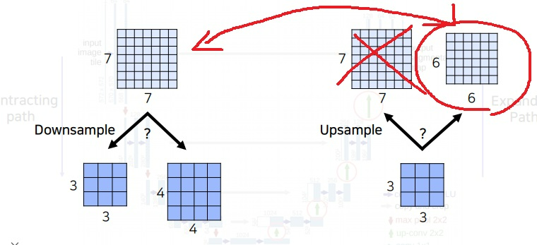 contracting path에서 해상도 크기를 절반씩 줄이는데 spatial size가 홀수이면 서로 다른 크기의 downsample들이 나옴