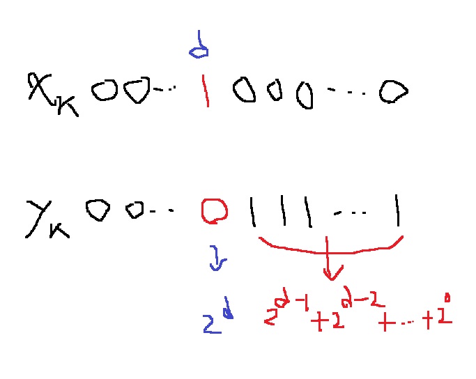 그리고, s의 d번째 자리가 1이고 $x_{k}$도 d번째 자리가 1이라고 가정했으므로, 동일한 1을 xor한 결과인 $y_{k}$의 d번째 자리는 0이다.