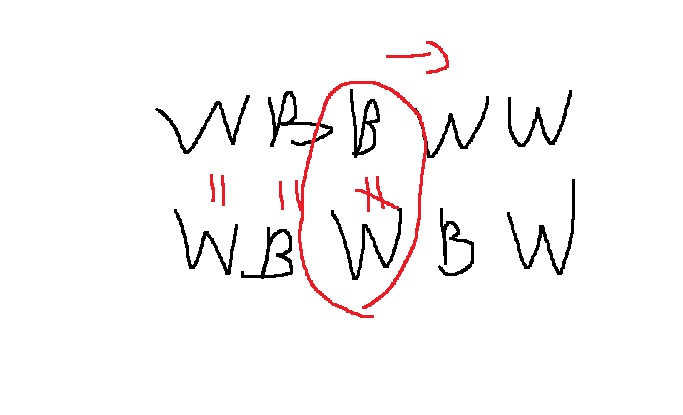 예를 들어 BBBBBBB를 BWBWBWB로 바꿀려면, 교환을 시도해야하는 대상 문자는 2번째, 4번째, 6번째의 B이다.