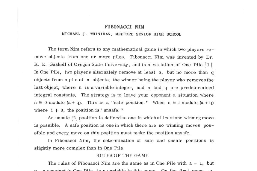 The Fibonacci Quarterly 1963년 12월 호에 이 게임의 필승전략이 증명되었다